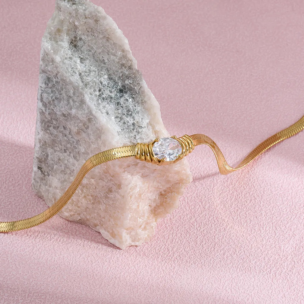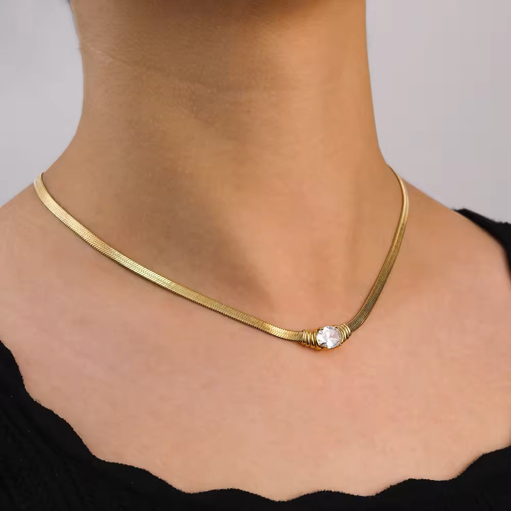 4MM Herringbone Oval Zirconia Pendant Snake Chain Necklace